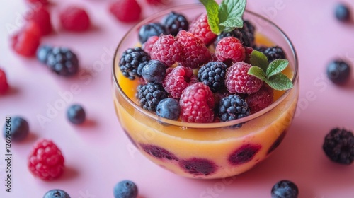 A vibrant bowl filled with a medley of raspberries, blueberries, and blackberries sits invitingly. Surrounding them are scattered berries, enhancing the colorful display ideal for a summer treat
