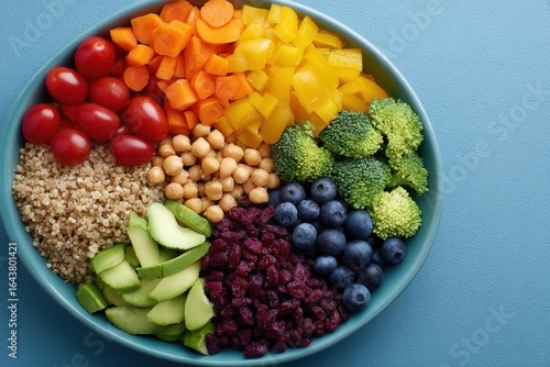 food, bowl, vegetable, fruit, grain, healthy, colourful, fresh, nourishment, diet, cooking, meal, ingredient, tomatoes, carrot, pepper, broccoli, cucumber, chickpea, blueberry, cranberry, organic, vegan, wellness, lifestyle, cookery, epicure, snack, salad, harvest, seasonal, natural, sustainable, vitamin, fiber, protein, delicious, appetising, presentation, table, dining