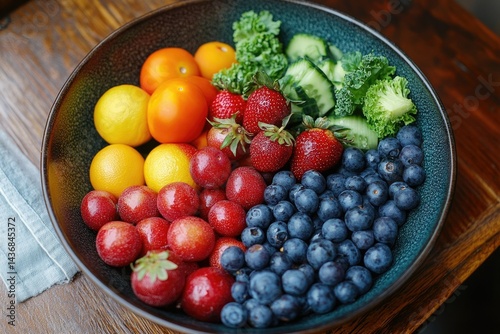 A vibrant bowl of fresh fruits and vegetables, including strawberries, blueberries, plums, oranges, tomatoes, cucumbers, and kale, arranged in a rainbow pattern.