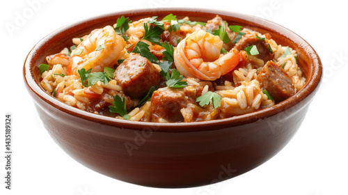 a vibrant bowl of shrimp and sausage jambalaya. featuring plump shrimp. savory sausage. and fluffy rice. garnished with fresh parsley this dish showcases a colorful mix of ingredients. highlighting a