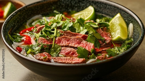 A vibrant bowl of Vietnamese pho with fresh herbs, lime wedges, and beef slices served in a traditional bowl.
