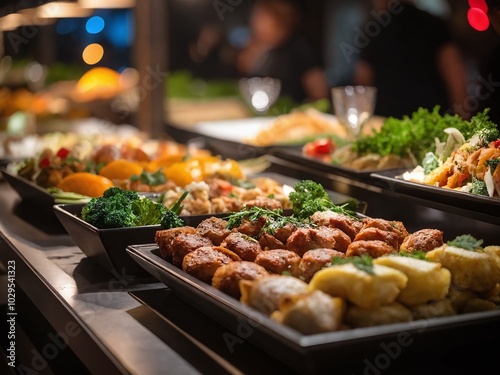 A vibrant buffet display of assorted dishes featuring fresh vegetables, seafood, and fruits in an elegant dining setting during an evening event