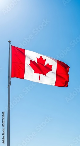 A vibrant Canadian flag billows proudly against a clear, bright blue sky.
