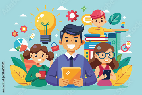 A vibrant cartoon showcases people using devices to share knowledge and brainstorm innovative concepts, Social ideas Customizable Cartoon Illustration