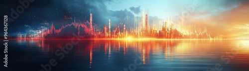 A vibrant city skyline at sunset, reflecting colors on the water with dramatic clouds in the background, creating an enchanting atmosphere.