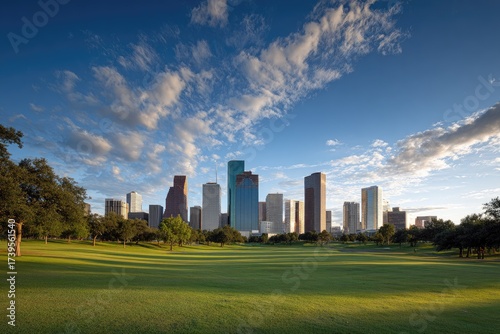 skyline, city, park, green, tree, blue, sky, cloud, sunlight, landscape, urban, architecture, building, tall, modern, grass, open, space, outdoors, day, nature, horizon, view, perspective, scenic, beautiful, composition, calm, tranquil, bright, warm, summer, clear, light, shadow, texture, line, shape, structure, elevation, metropolitan, distant, far, wide, natural, background, high-coloured, aesthetic, growth