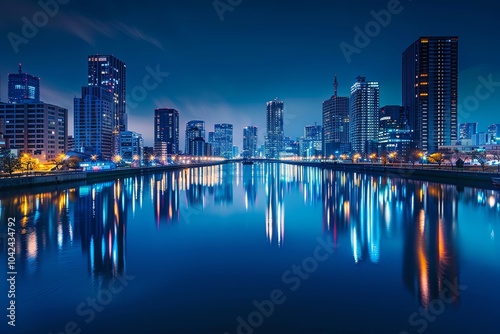 A vibrant cityscape at night with tall skyscrapers reflected in a calm river.
