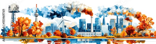 A vibrant cityscape blending nature and industry, showcasing autumn colors, wind turbines, and smoke, reflecting the contrast between urban life and environmental concerns.