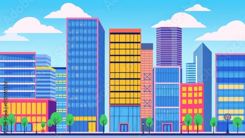 A vibrant cityscape illustration showcases a row of modern colorful skyscrapers under a bright sunny sky with fluffy white clouds and green trees.