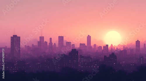 A vibrant cityscape silhouette against a pink and orange sunset sky.