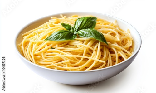 A vibrant clip art of a bowl filled with fluffy boiled spaghetti, garnished with fresh basil and a drizzle of olive oil, set against a clean white background, ideal for Italian cuisine marketing