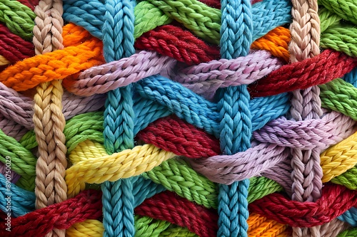 A vibrant close up of intertwined colorful ropes, a detailed and textured pattern of woven fibers, a symbol of harmony and cooperation, how individual elements can create a beautiful whole