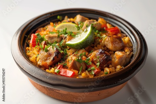 culinary, rice, dish, garnish, herb, lime, traditional, food, cookery, closeup, vibrant, meal, epicure, plate, dinner, colourful, appetising, tasty, delicious, fresh, cooked, chicken, vegetable, pepper, grain, lifestyle, healthy, alimentary, receipe, homemade, ethnic, organic, savoury, mediterranean, presentation, eatery, dining, chef, kitchen, ingredient, paprika, seasoning, parsley, cilantro, table, bowl, rustic