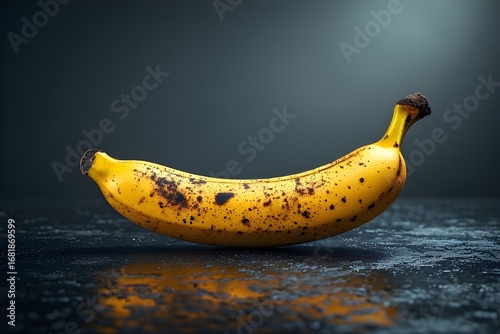 A vibrant, close-up perspective of a perfectly ripe banana. The banana's peel unfurls in a graceful arc, revealing the tender, golden flesh beneath. Each curve and crevice of the fruit is highlighted