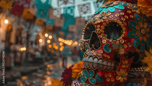 A vibrant, close-up shot of a decorative sugar skull, richly adorned for the Day of the Dead celebration, with soft focus background.
