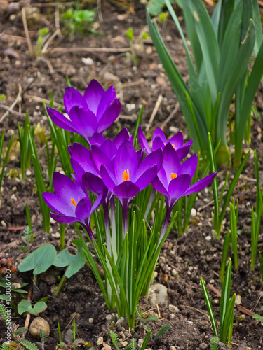A vibrant cluster of purple crocuses blooming in spring in Romania