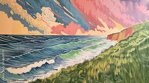ocean, wave, grass, sky, cloud, colours, landscape, nature, shore, coastline, scenery, calmness, beauty, horizon, sunset, environment, art, illustration, texture, movement, water, cliff, green, blue, pink, yellow, peaceful, seascape, light, pattern, design, creative, artistic, vibrant, dynamic, lush, scenic, rural, earth, marin, atmosphere, visual, coastal, view, element, space, harmony