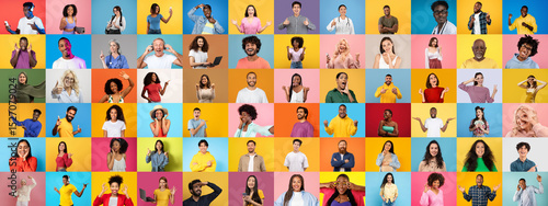 A vibrant collage features a diverse collection of people showcasing various emotions and activities. Each individual reflects a different background, emphasizing unity in diversity.
