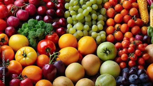 A vibrant collage of various fruits and vegetables,