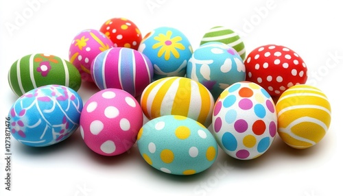 A vibrant collection of Easter eggs arranged closely on a clean white surface, showcasing their intricate colors and designs.