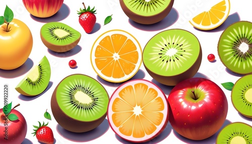 A vibrant collection of fresh, juicy fruits including kiwi, orange, lemon, apple, strawberry, and pineapple, isolated on white for a healthy, sweet, and vitamin-rich set