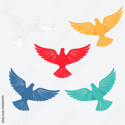 A vibrant collection of stylized dove illustrations in flight. Colorful bird icons symbolizing peace, freedom, and hope.