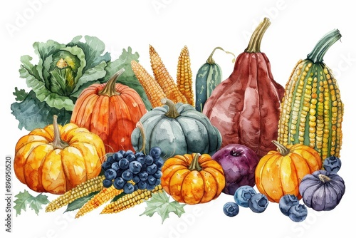 A vibrant collection of watercolor fruits and vegetables, showcasing pumpkins, corn, and colorful berries in a seasonal arrangement.