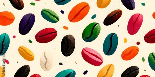 coffee bean, pattern, colourful, background, texture, abstract, design, vibrant, food, illustration, beige, surface, scattered, hue, art, creative, decorative, seamless, wallpaper, caffeine, aroma, drink, brown, green, blue, red, orange, yellow, purple, stylish, modern, cafes, simple, bean