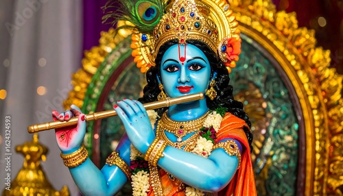 A vibrant, colorful idol of the Hindu god Krishna, depicted with blue skin and playing a golden flute, adorned with a peacock feather.