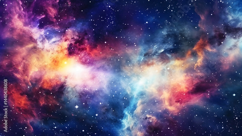 A vibrant, colorful nebula with a mix of warm and cool colors, featuring a star field and a large, bright nebula in the center.