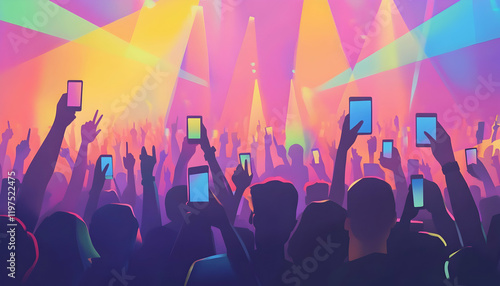 A vibrant concert crowd with hands raised, holding smartphones against colorful stage lighting -