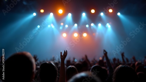 concert, music, performance, stage, light, crowd, audience, hand, raised, cheering, energy, atmosphere, entertainment, live, show, festival, party, gathering, night, blue, orange, glow, illuminated, spotlight, vibrant, dynamic, exciting, joyful, energetic, passionate, spectacle, visual, smoke, haze, beam, ray, bokeh, abstract, colourful, bright, dramatic, mood, sound, rythm, beat, dancing, singing, jumping