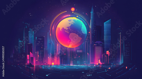 digital artwork, globe, neon light, technology, city skyline, city landscape, innovation, atmosphere, cosmic, abstract art, night scene, bright, creative, globalisation, ai, fantasy, space, artistic, vector graphics
