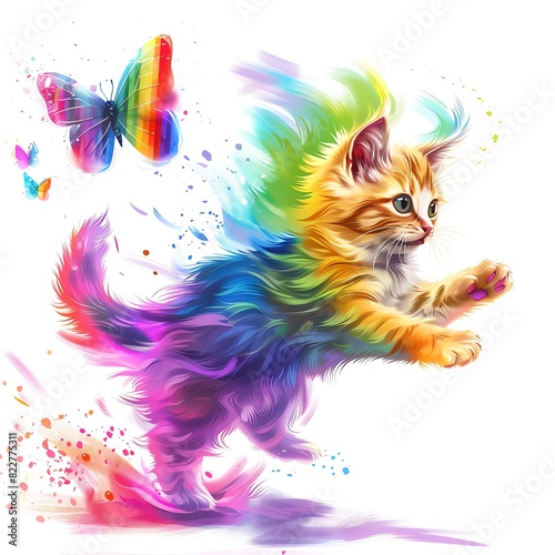 A vibrant digital illustration of a playful kitten with a rainbow-colored tail chasing a colorful butterfly on a white background.