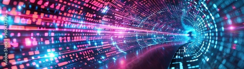 A vibrant digital tunnel with glowing lights, representing technology, speed, and futuristic design.