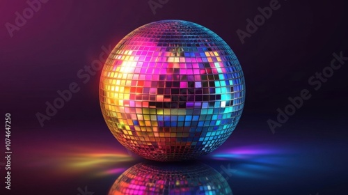 A vibrant disco ball reflecting colorful lights against a dark background, creating a festive atmosphere.