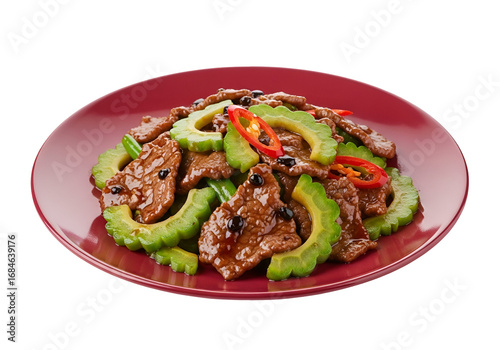 A vibrant dish of stir-fried beef and bitter melon, highlighted by rich brown sauce and contrasting green vegetables, presented on a deep maroon plate against a striking black background.