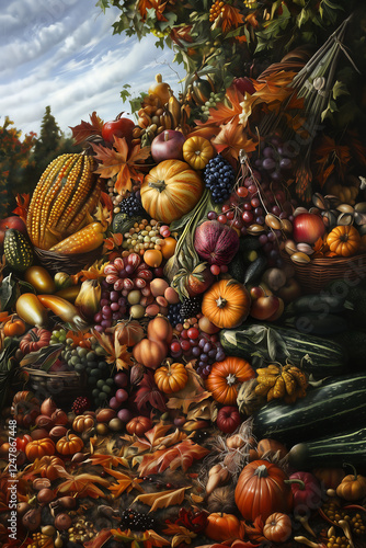 A vibrant display of autumn harvest featuring colorful pumpkins, gourds, and various fruits surrounded by fallen leaves, embodying the beauty and abundance of the season.
