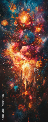 A vibrant display of fireworks explodes over a city skyline, creating a mesmerizing spectacle of light and color.