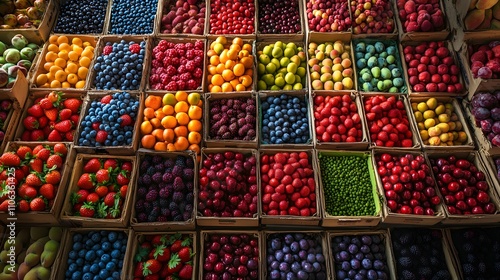 A vibrant display of fresh berries at an outdoor farmers' market, with strawberries, blueberries, and cherries neatly arranged in rows on boxes