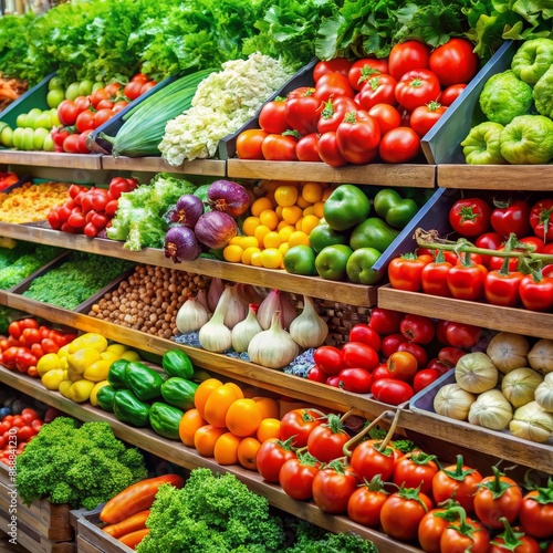 A Vibrant Display of Fresh Produce at a Farmer's Market, Featuring Tomatoes, Peppers, Garlic and More, Market Stall, Fresh Produce, Farmers Market