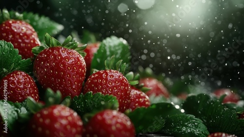 A vibrant display of fresh strawberries glistening in the rain, with a magical background featuring sparkling droplets that enhance the enchanting scene.