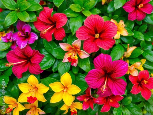 A vibrant display of hibiscus flowers in various colors surrounded by lush green leaves in full bloom