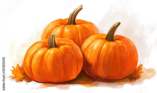 A vibrant display of three ripe pumpkins surrounded by autumn leaves on a soft background