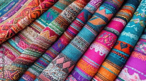 A vibrant display of woven textiles showcasing intricate patterns and colors, representative of traditional craftsmanship and cultural heritage.