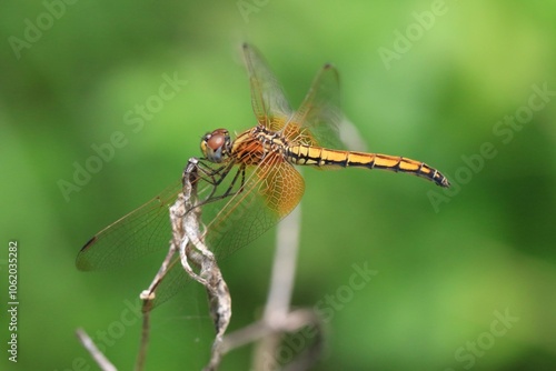 dragonfly, insect, invertebrate, arthropod, odonata, wildlife, nature, outdoors, water, duck pond, lake, river, shore, plant, reed, stem, green, brown, red, black, wing, eye, chested, abdomen, long, slender, detailed, intricate, animal kingdom, natural light, selective focus, composition, framing, perspective