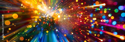 A vibrant explosion of colorful light streaks and bokeh effects creating a dynamic and lively abstract background bursting with energy.