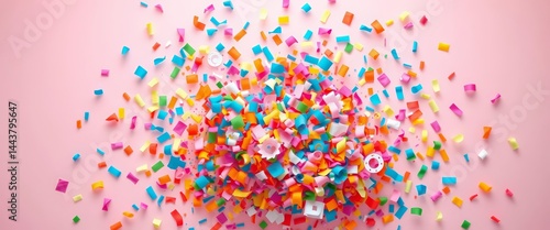 A vibrant explosion of colorful paper confetti against a soft pastel pink backdrop, colorful, pastel backdrop