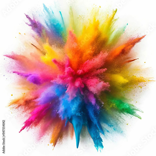 A vibrant explosion of colorful powder on a white background,