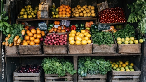 A vibrant farm market stall filled with colorful fruits and vegetables, with farm-fresh produce and rustic wooden crates.
